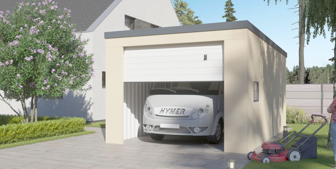 Hochwertige DuroBox Einzelgarage Typ "Caravan". Die günstige Flachwand-Garage mit einem Hörmann-Markentor und erhöhter Durchfahrt. Die Außenwand ist flach, langlebig verzinkt und mit robustem Kunstharzputz versehen. Die Farbe können Sie im Konfigurator ohne Aufpreis in vielen verschiedenen Farben auswählen.